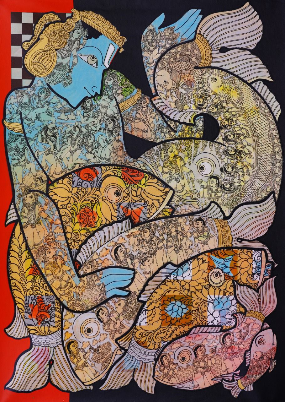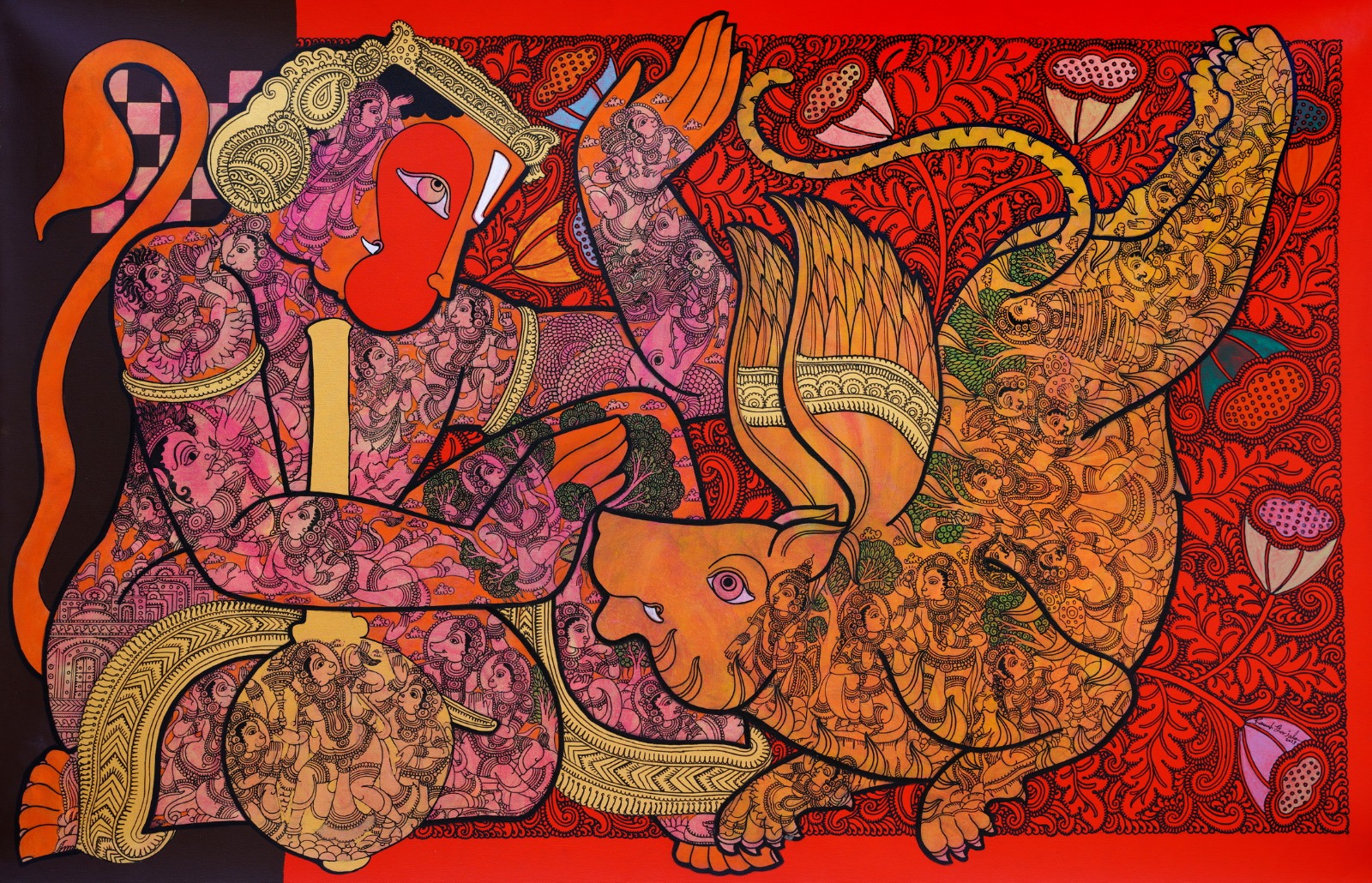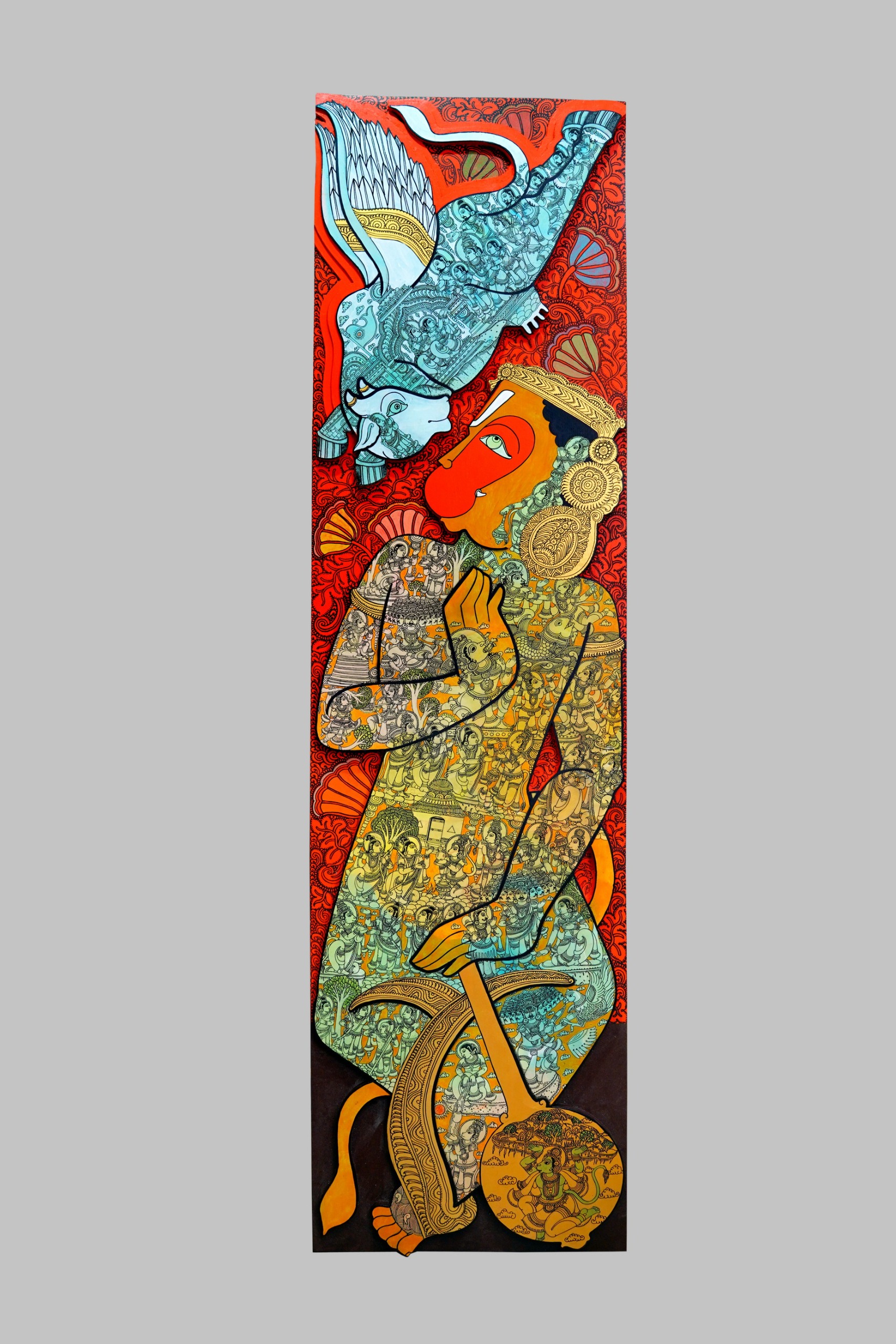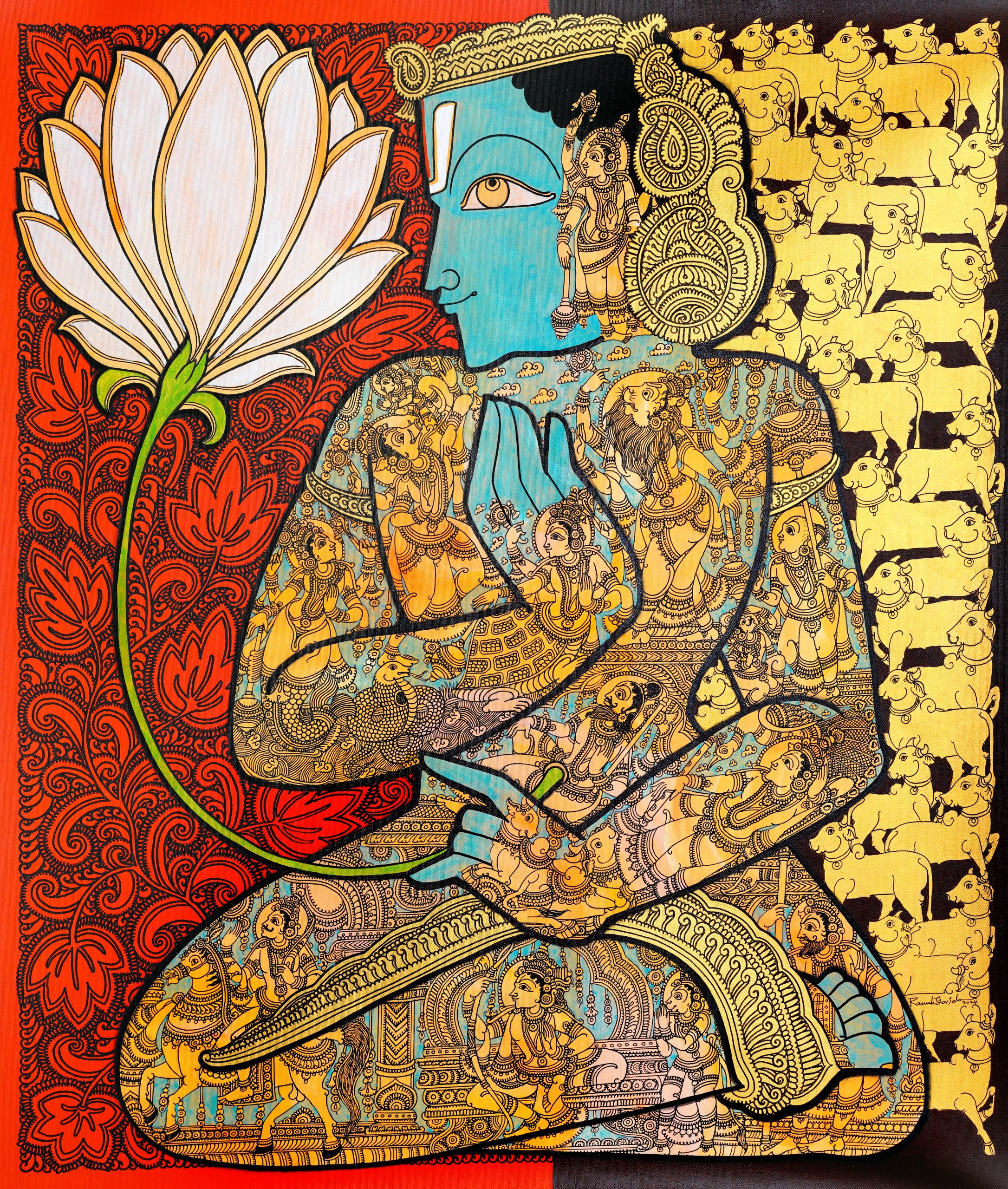 My subjects are deeply rooted in Indian mythology: the serene presence of Buddha, the divine mischief of Krishna, the strength of Hanuman, the wisdom of Ganesha, and the many forms of Vishnu. What makes my work unique is how these divine figures come to life not just as single portraits, but as layered narratives where within the main form, you’ll see smaller stories unfold, intricately woven into their being.