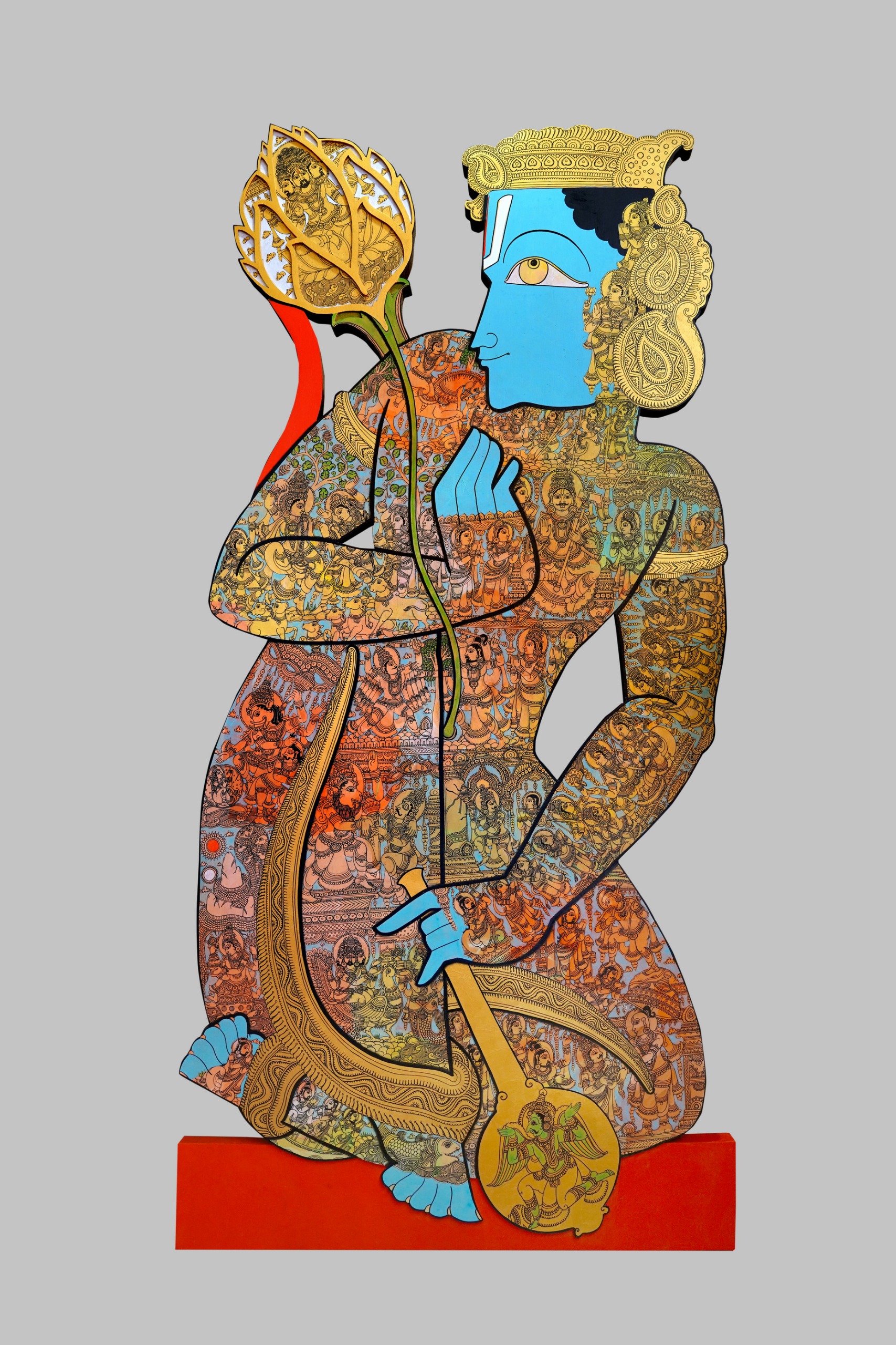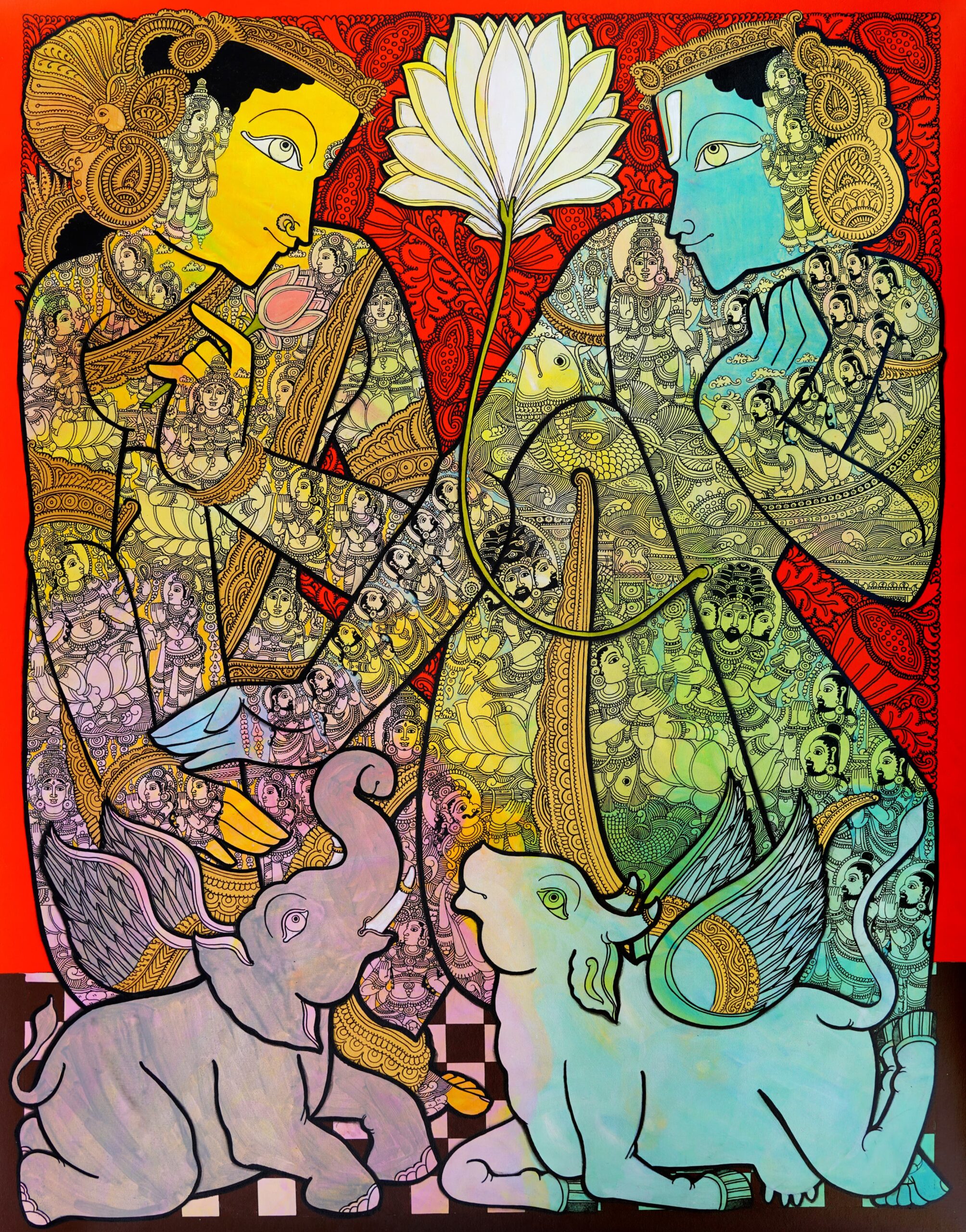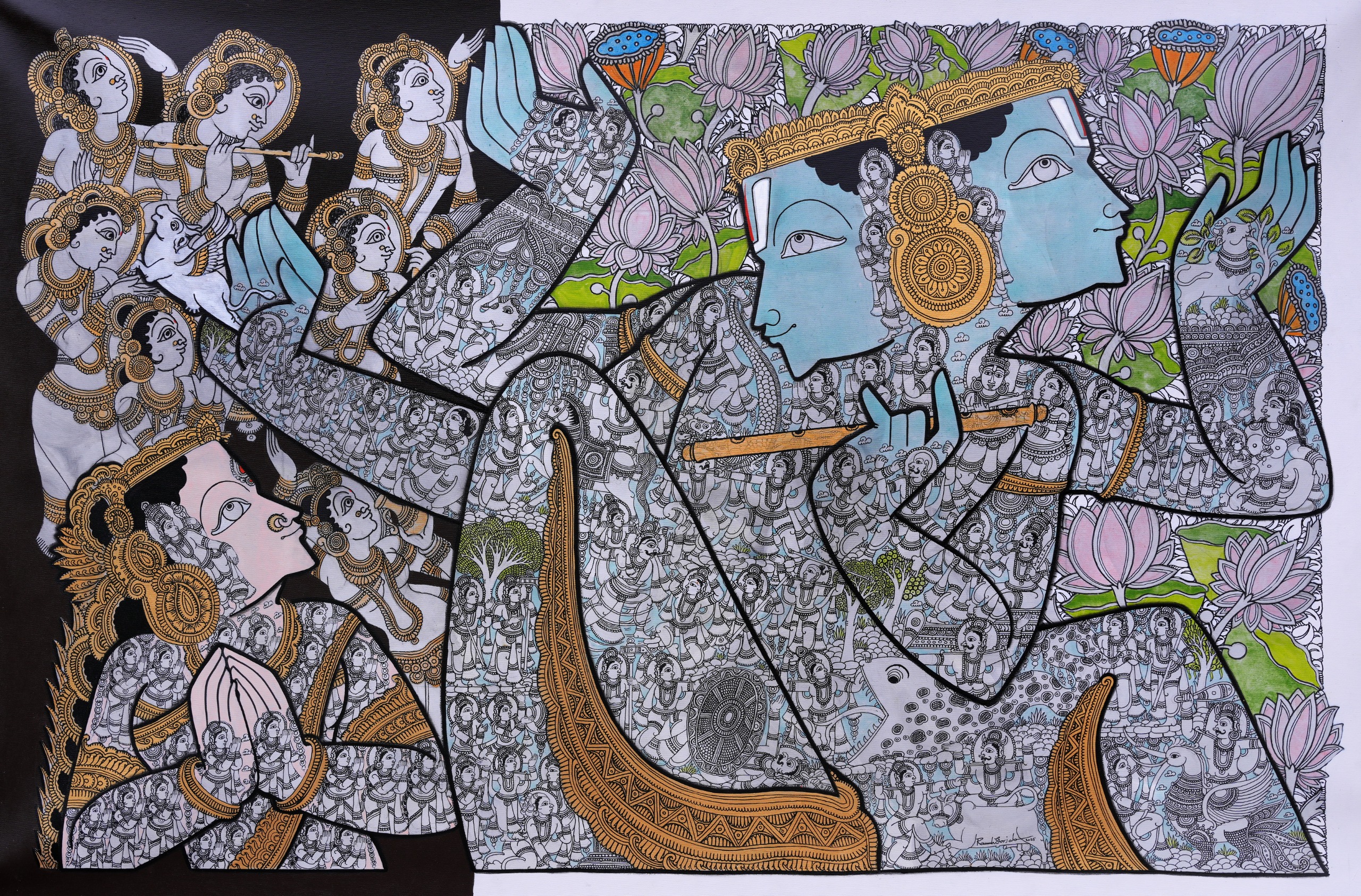 My subjects are deeply rooted in Indian mythology: the serene presence of Buddha, the divine mischief of Krishna, the strength of Hanuman, the wisdom of Ganesha, and the many forms of Vishnu. What makes my work unique is how these divine figures come to life not just as single portraits, but as layered narratives where within the main form, you’ll see smaller stories unfold, intricately woven into their being.