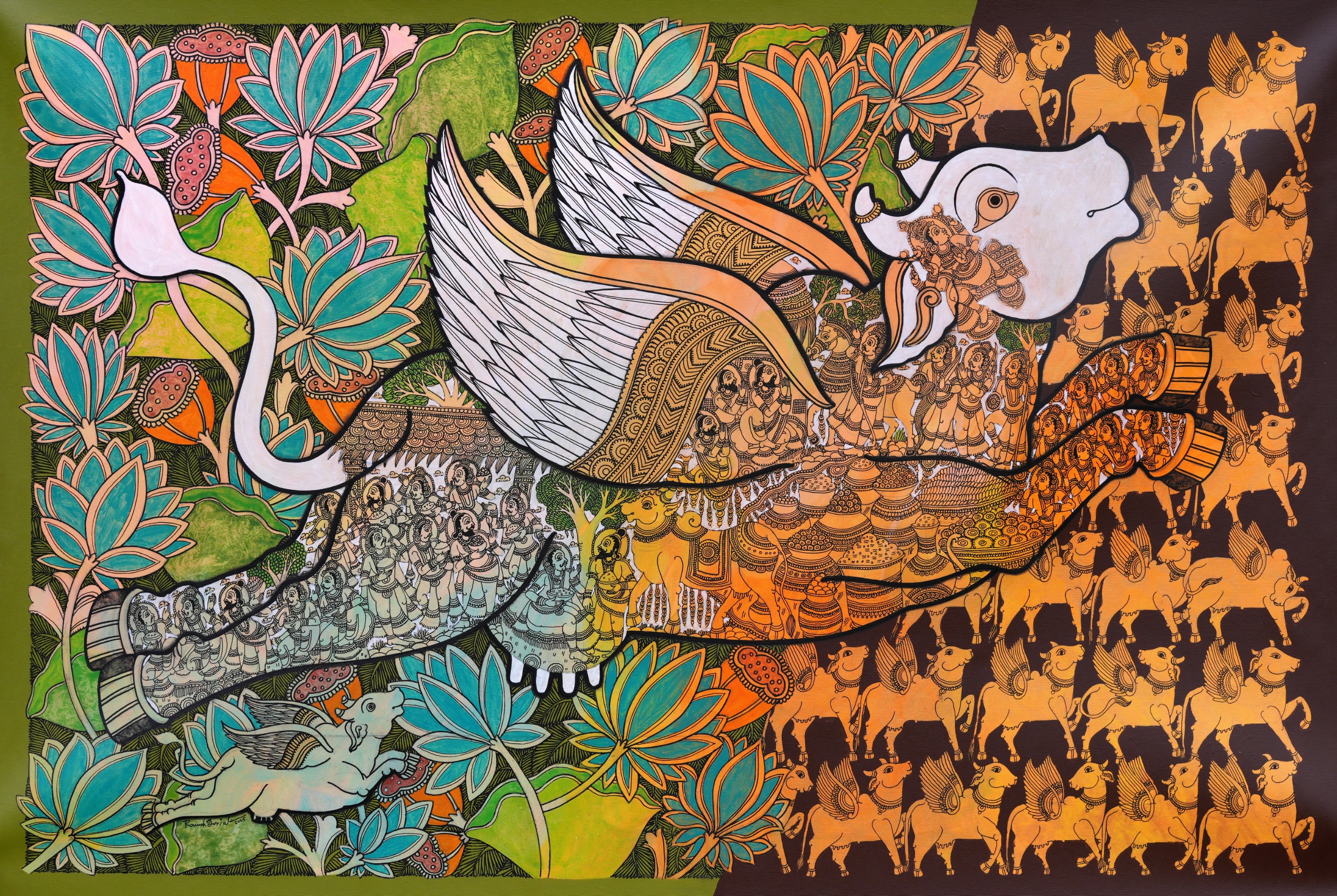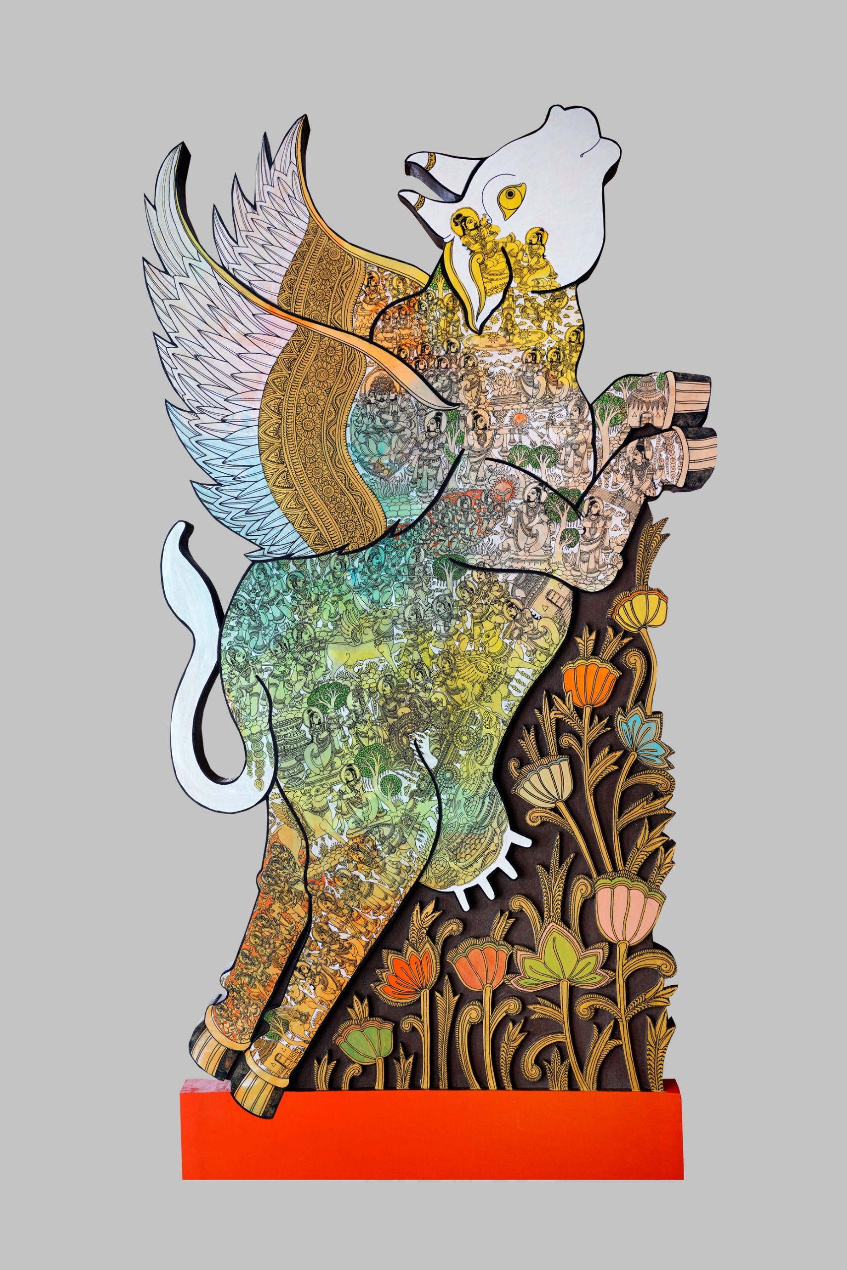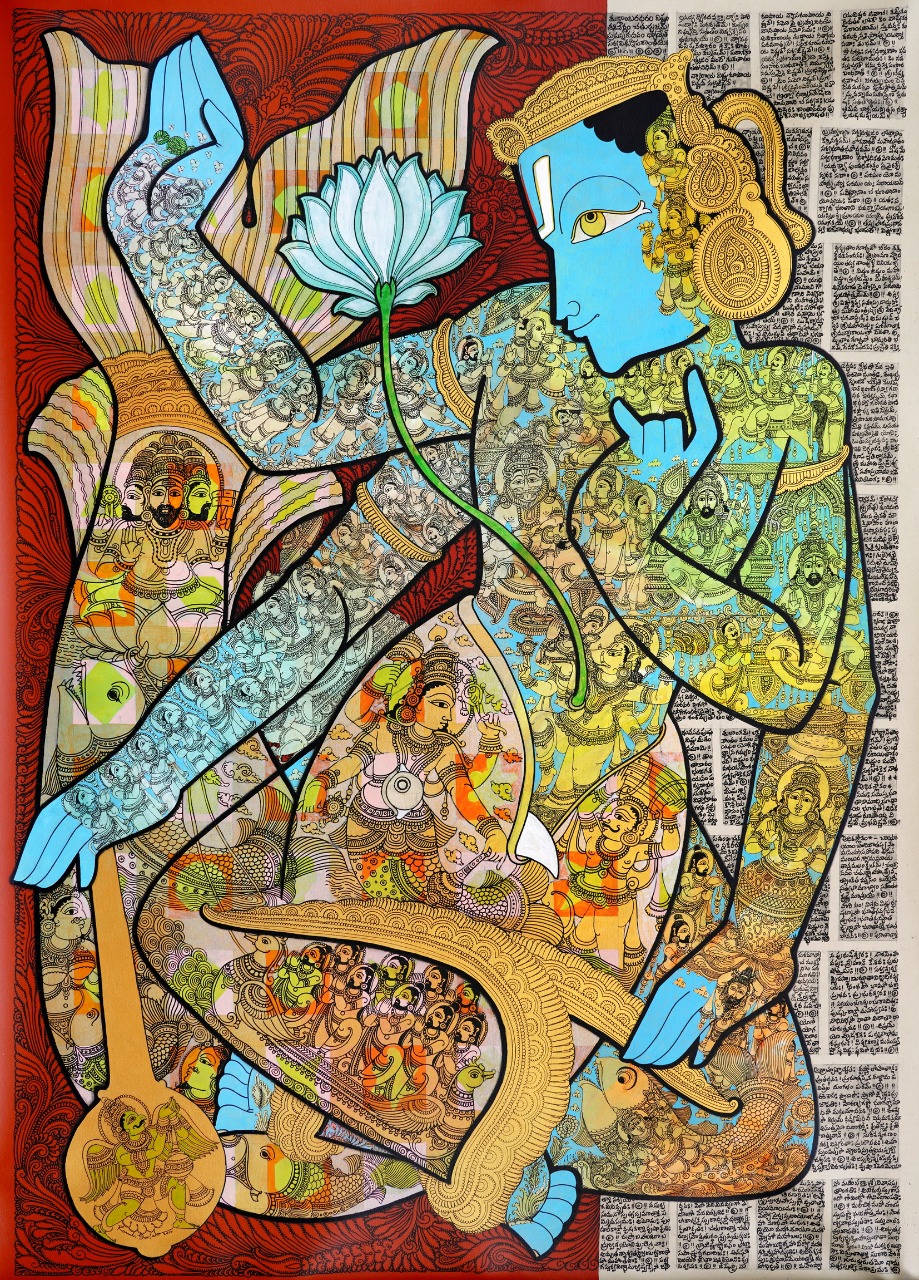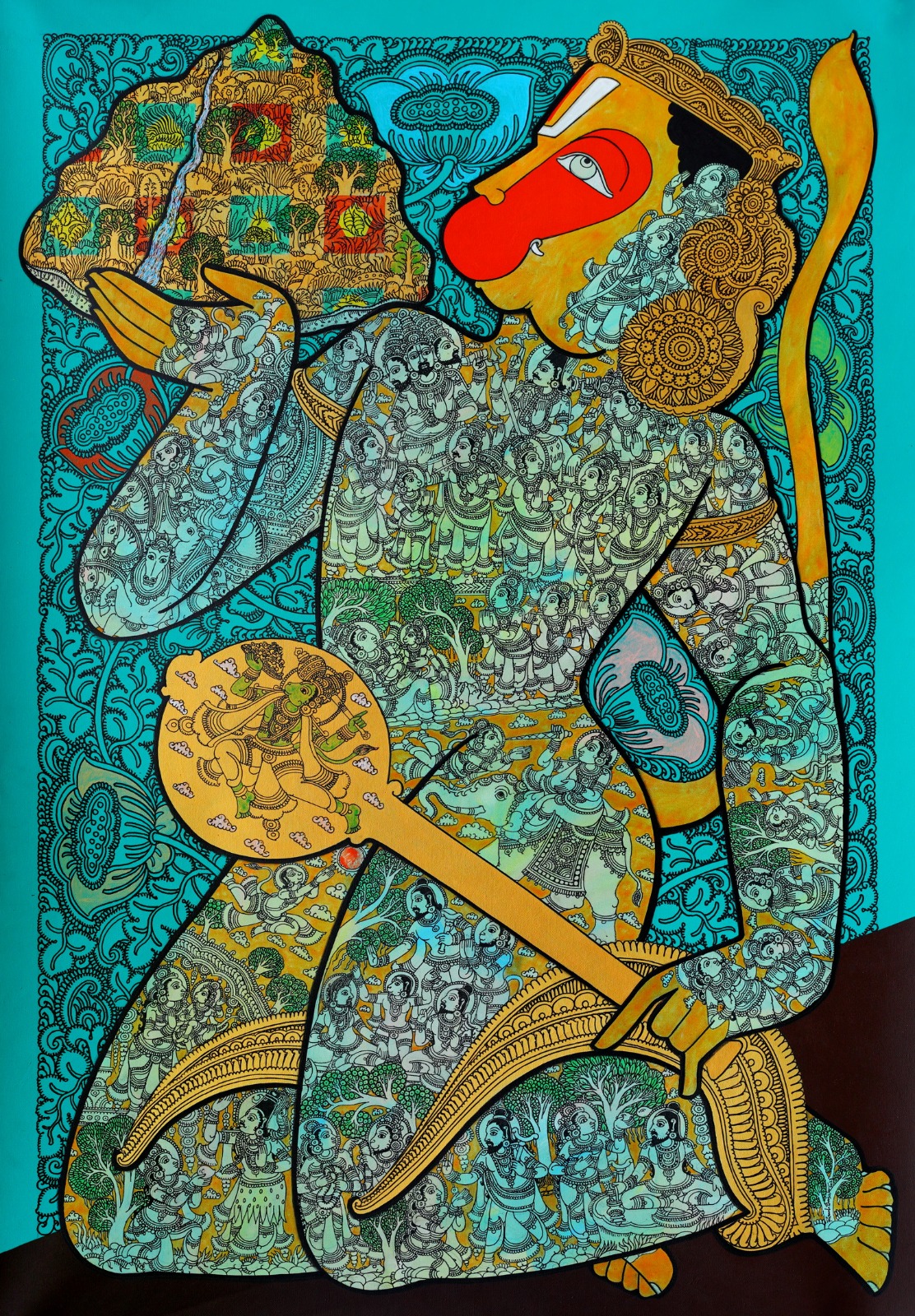 My subjects are deeply rooted in Indian mythology: the serene presence of Buddha, the divine mischief of Krishna, the strength of Hanuman, the wisdom of Ganesha, and the many forms of Vishnu. What makes my work unique is how these divine figures come to life not just as single portraits, but as layered narratives where within the main form, you’ll see smaller stories unfold, intricately woven into their being.