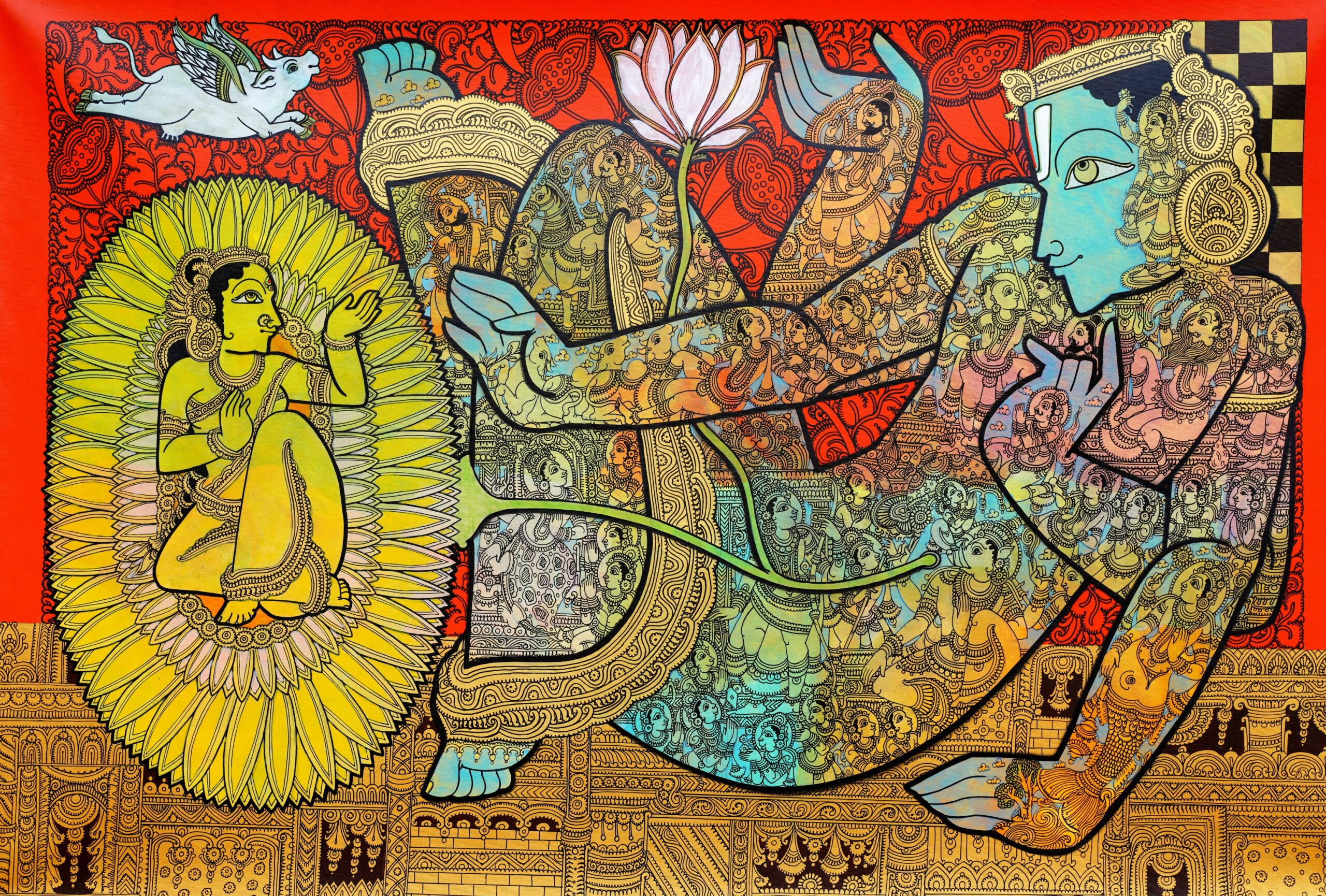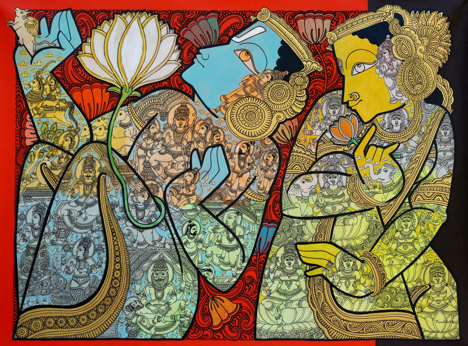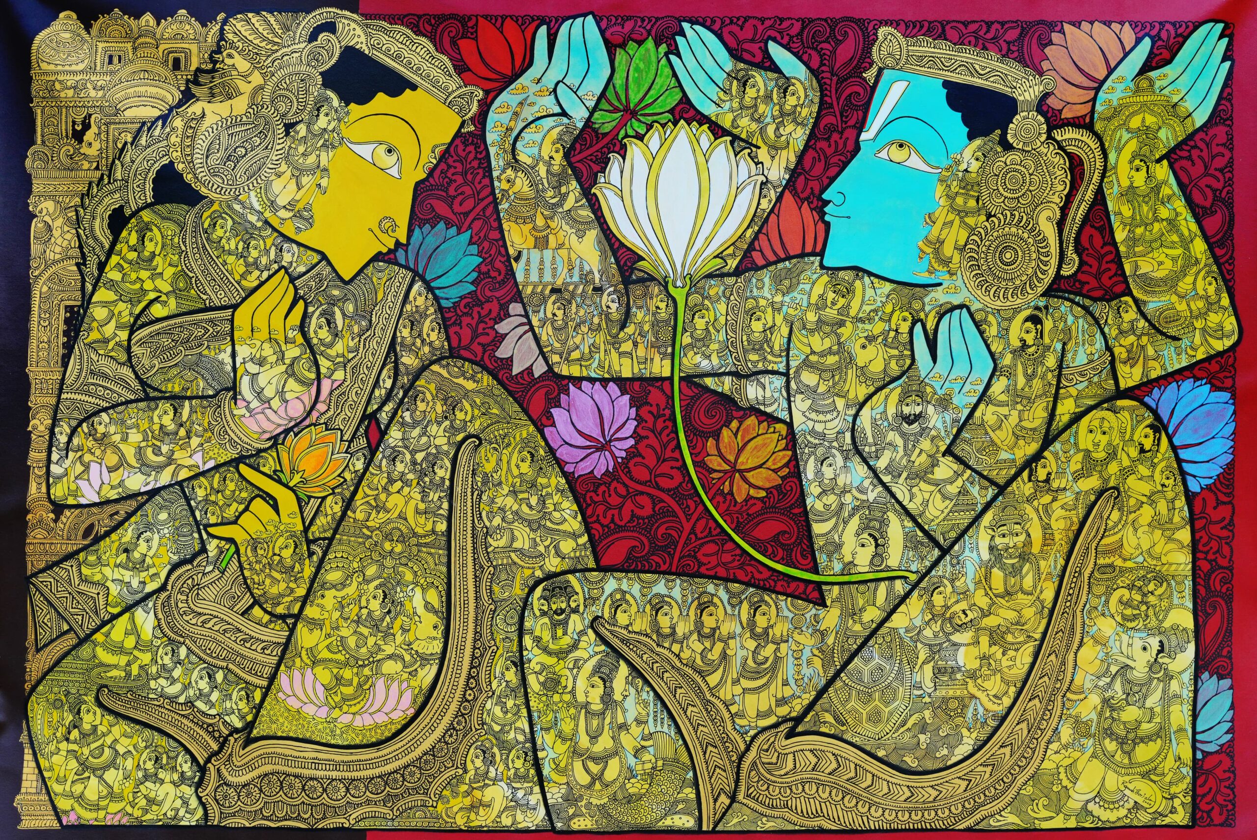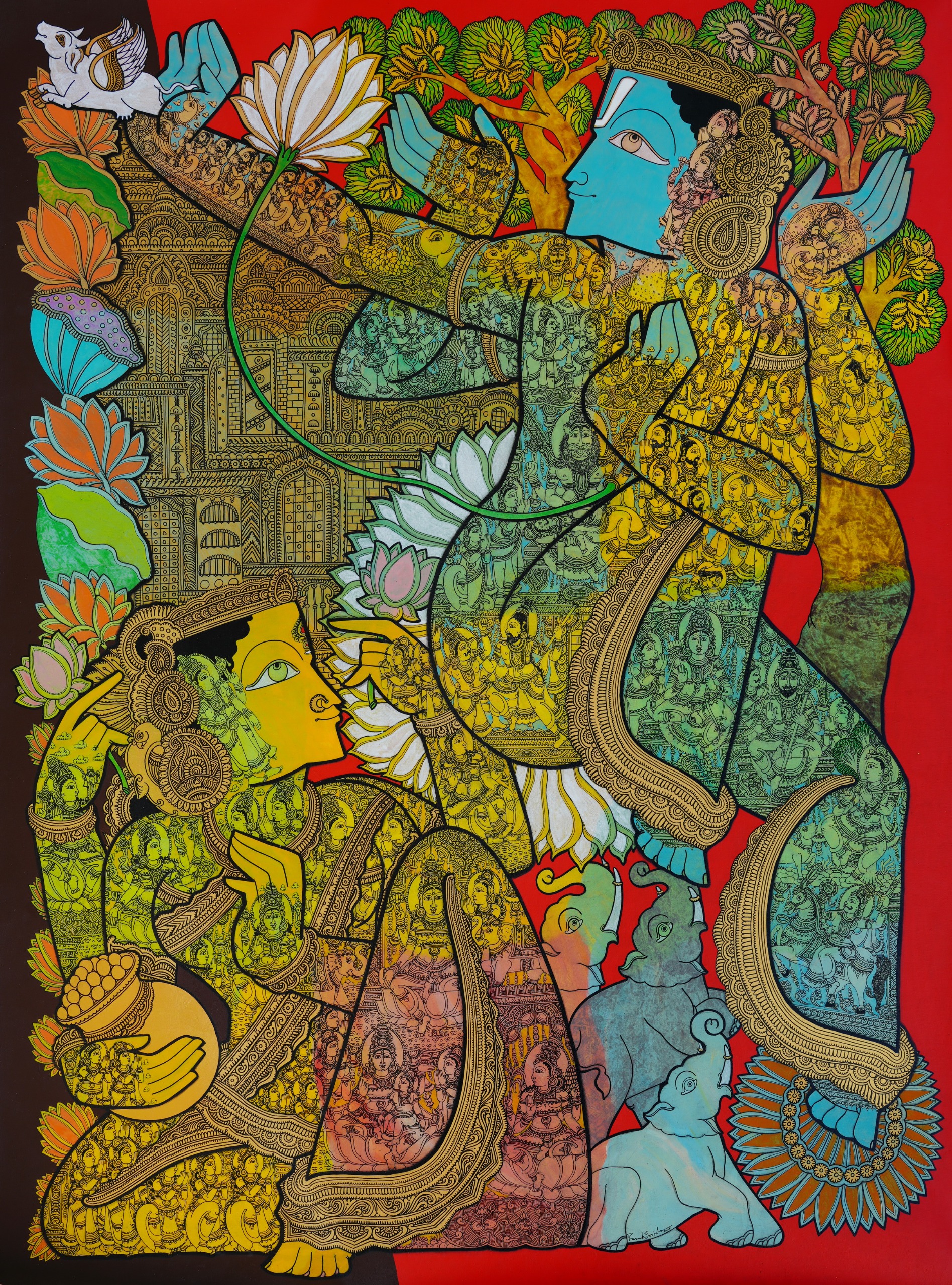 I work primarily with acrylic on canvas and handwoven paper, combining traditional Kalamkari-inspired detailing with contemporary expression. My palette is warm and grounded rich reds, earthy greens, subtle golds each chosen to reflect the spiritual and emotional weight of the subject.